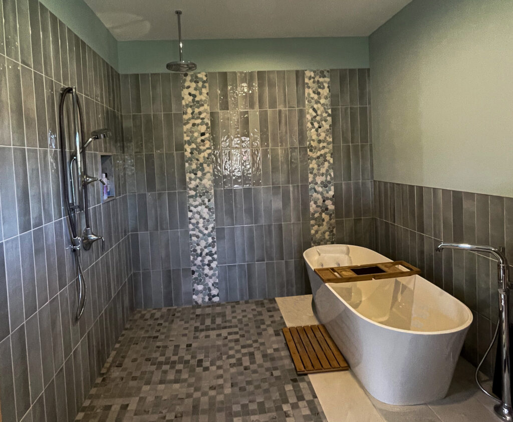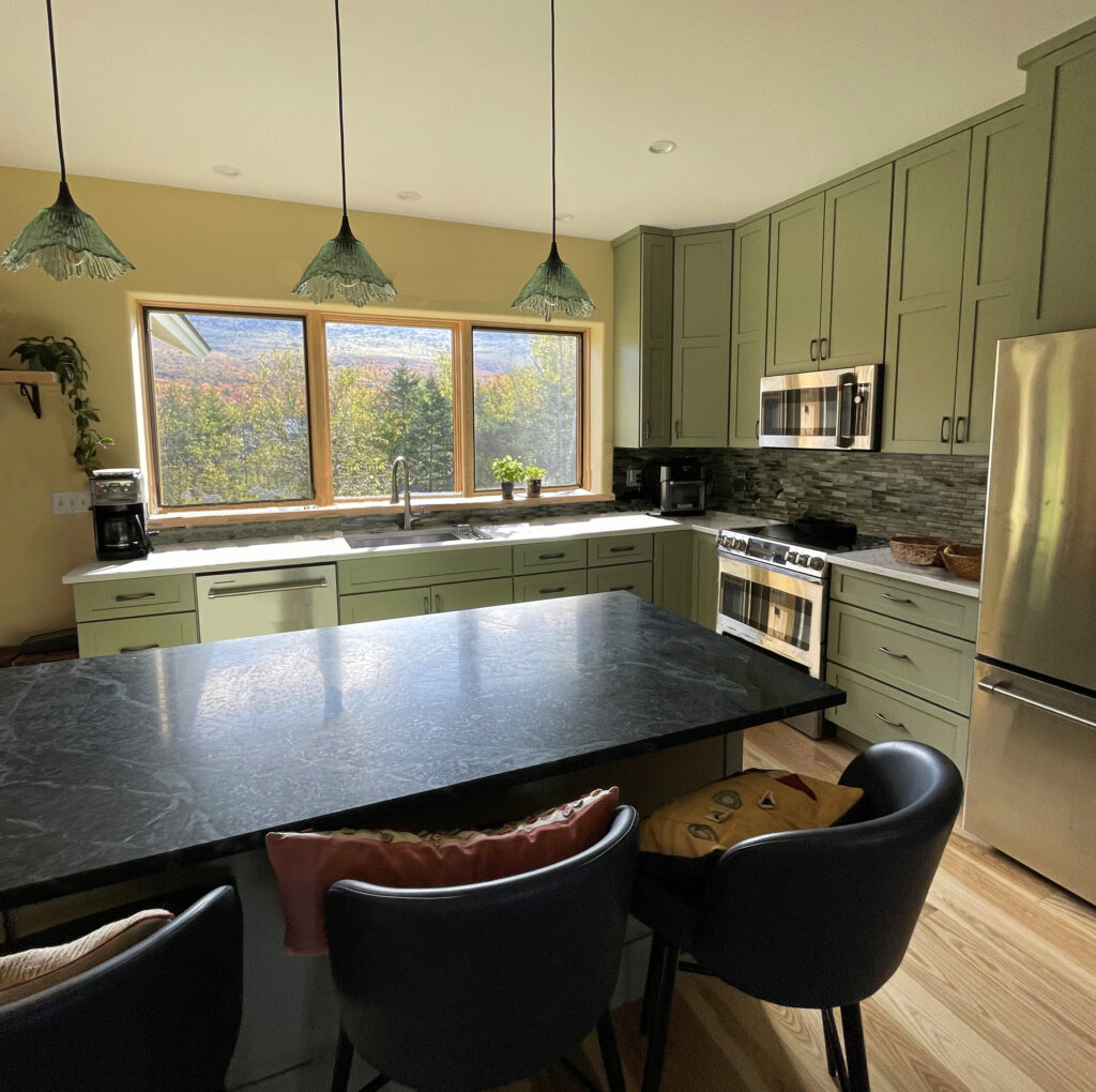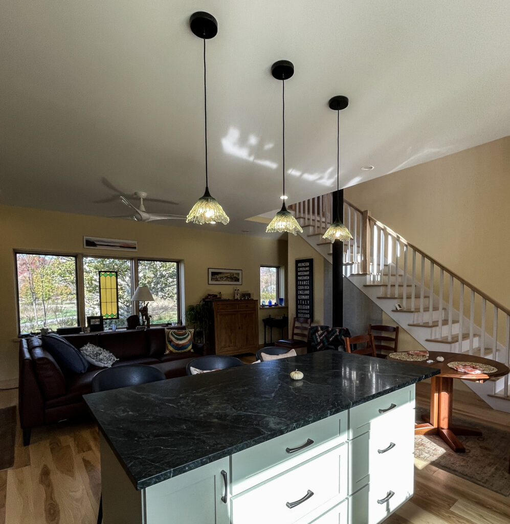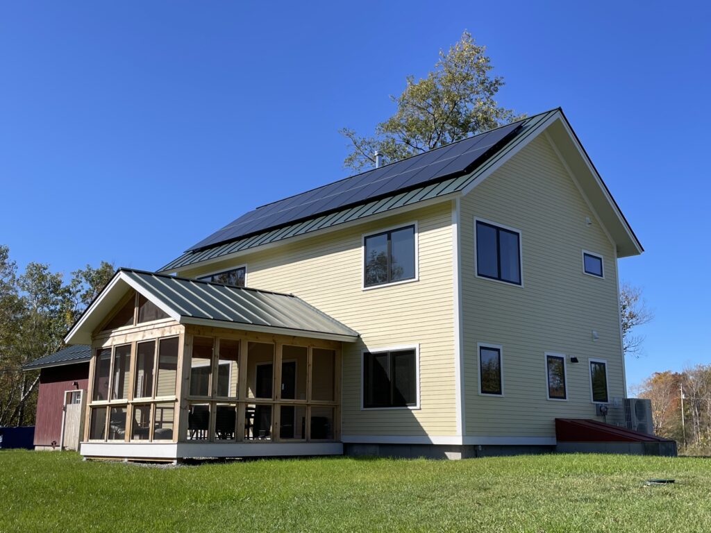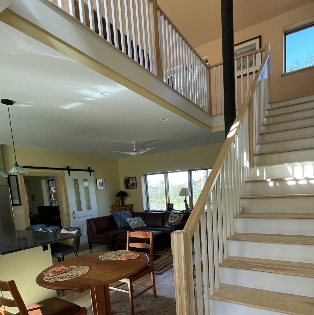 My clients found a lot with abandoned but well built foundation. We used the existing foundation to save on the budget, but it meant squeezing the program of their dream house fit on the small foot print. The house feels expansive because of the long sight lines to the surrounding views and windows placed to capture the light. We add foundation for the two car garage and connecting breezeway/mudroom. The house is thermally tight, with thick well-insulated walls and roof and added insulation to the existing foundation. It is heated with a furnace/heat pump combination and mechanically ventilated. Added energy comes from the solar panels.